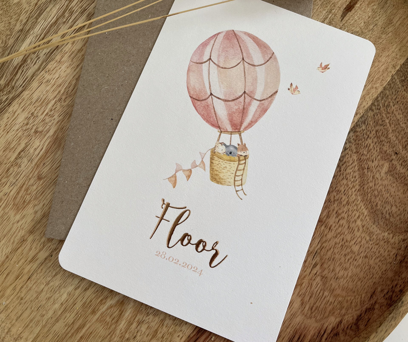 Kaartjes met thema's zoals sterren, de maan en luchtballonnen nemen je mee naar een dromerige wereld. Zachte kleuren en lieve illustraties creëren een tedere en romantische sfeer, ideaal voor de aankondiging van jullie babytje.