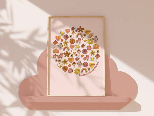 Op de poster is een cirkel met daarin allerlei symbolen die passen bij Flower Power. Van peace tekens en hartjes tot bloemetjes, rolschaatsen en vrolijke paddenstoelen. Elk detail van deze poster liefdevol vervaardigd om een unieke en speelse sfeer te creëren die zeker weten een glimlach op je gezicht tovert. Ook staat er nog een leuke quote, namelijk 'Bloom with kindness!', want vriendelijk zijn is een goede boodschap!