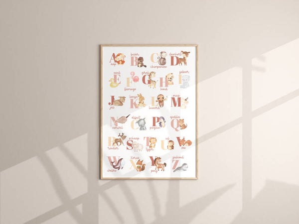 Maak kennis met de vrolijke wereld van het ABC met deze schattige ABC Alfabet met dieren poster in zachte, rozige tinten! Elke letter van het alfabet wordt vertegenwoordigd door een lief, knuffelbaar dier, van Aap tot Zeehond. Deze poster is niet alleen educatief, maar ook een feestje voor het oog met zijn zachte, pastelroze tinten en levendige, maar toch ingetogen illustraties.