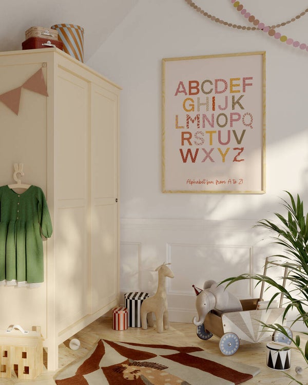 Spelenderwijs leren wordt een feestje met deze kleurrijke alfabetposter. Elke letter is uniek vormgegeven in een speelse mix van patronen en warme, aardse tinten, perfect passend bij een boho of eclectische kinderkamerstijl!